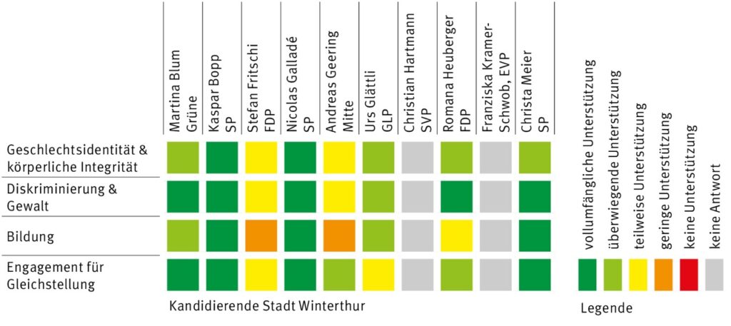 Während sich die Kandidierenden von SP, Grünen, AL und GLP klar für eine Ausweitung der Anti-Rassismus-Strafnorm um Geschlechtsidentität und Geschlechtsmerkmale aussprechen, sprechen sich die Kandidierenden von Mitte und teilweise FDP dagegen aus. Einheitlicher sind die Meinungen zur Erfassung statistischer Daten, die nur von Stefan Fritschi (FDP) sowie Andreas Geering (Mitte) deutlich abgelehnt wird. Ein Verbot von Konversionsmassnahmen wird hingegen von allen Kandidierenden klar unterstützt.
