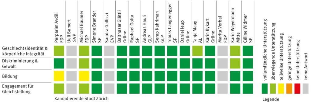 Der Zugang zu medizinischen Leistungen für minderjährige trans Personen wird von den Kandidierenden grossmehrheitlich befürwortet. Andreas Hauri (GLP) betont, dass eine intensive psychologische Begleitung wichtig sei – auch nach dem medizinischen Eingriff. Gemäss Përparim Avdili (FDP) stehe aus liberaler Sicht die Selbstbestimmung der betroffenen Jugendlichen im Vordergrund. Es stelle sich jedoch die Frage, ab wann Minderjährige fähig seien, solche Fragen zu entscheiden.