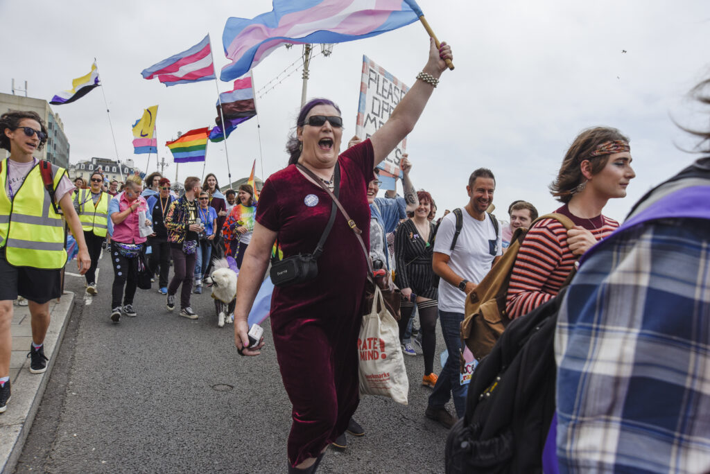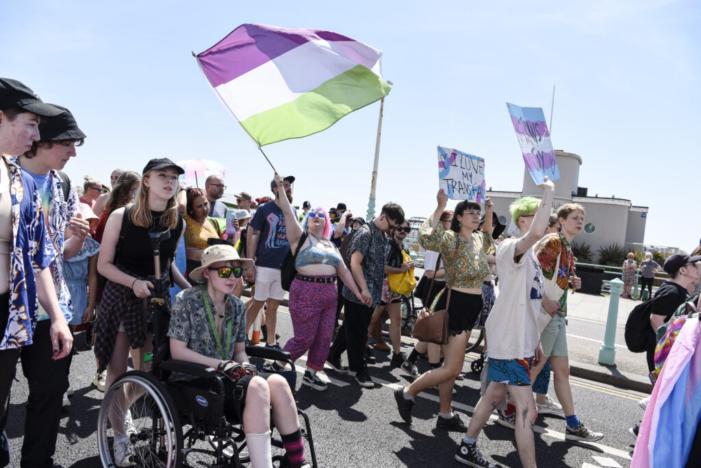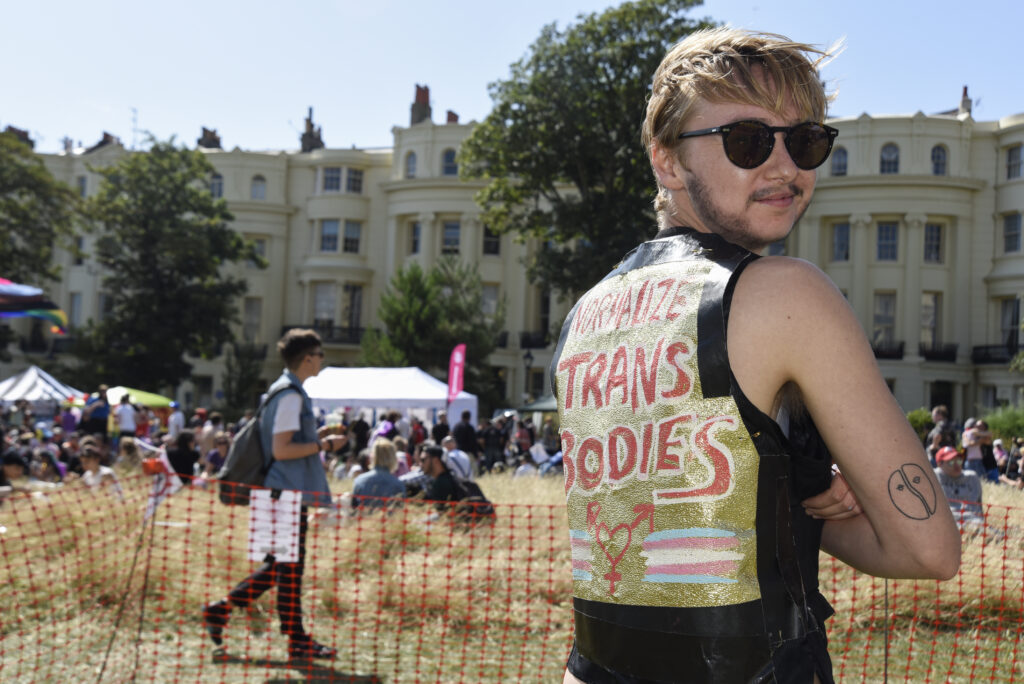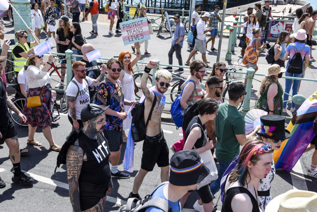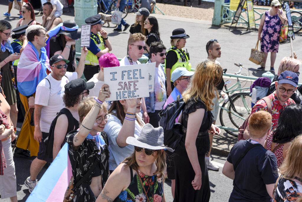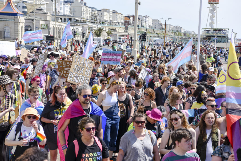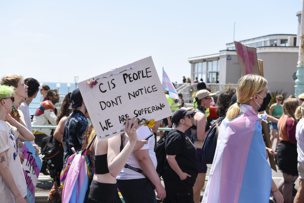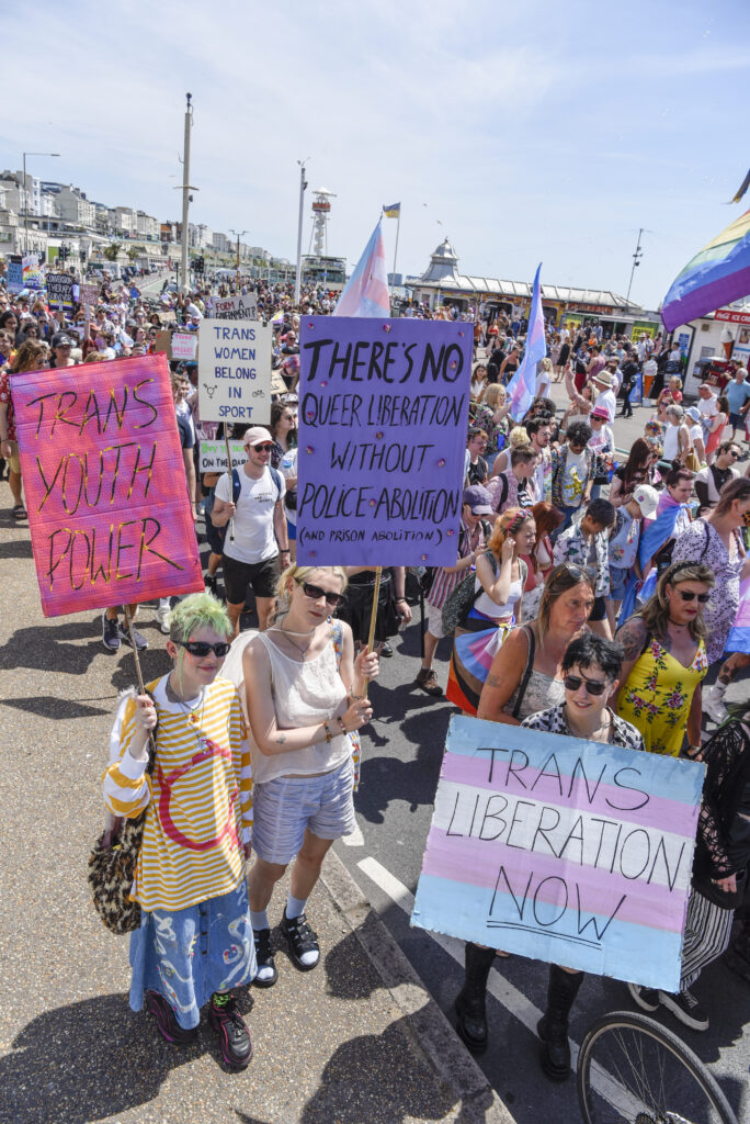 Just in diesem Brighton war es, da im Jahr 2013 die allererste Trans Pride ausserhalb der USA stattfand, mit ein paar Hundert Teilnehmenden, initiiert von fünf lokalen trans Menschen, die sich an der sogenannten Main Pride, die vor allem das L, das G und das B feierte, nicht repräsentiert und willkommen fühlten. Seither gibt es sie. Gewachsen in ihrer Grösse, ist sie ihrem grassroots Ursprung treu geblieben: Von der Community für die Community. Nicht dem Sponsoring verfallen, sondern ein politischer Protest wie eh und je (remember, the first pride was a riot). Keine Soundwagen, sondern eine kürzere und zugänglichere Route. Keine Firmen-Banner, nur ein wogendes Meer aus Kartonschildern, Flaggen und wunderschönen Menschen. Die Themen ähneln sich hier und da: Verbot von Konversions-Therapien, f*** JK Rowling (3), Trans Rights are Human Rights, Protect Trans Kids (4). Die Menge Menge an kreativen und pointierten Sprüchen auf den Schildern ist ein kleines Highlight.